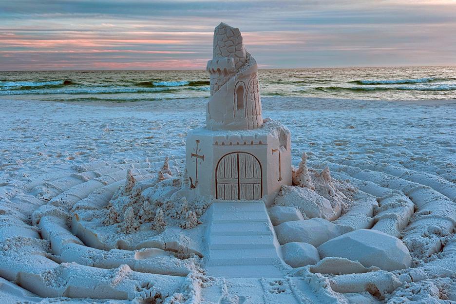 Was meinen Sie: Ist die Sandburg links durch Wind und Wellen entstanden? Ist sie das Ergebnis blosser Naturprozesse? Lässt sie sich mit Zufall und Naturgesetzen erklären?
