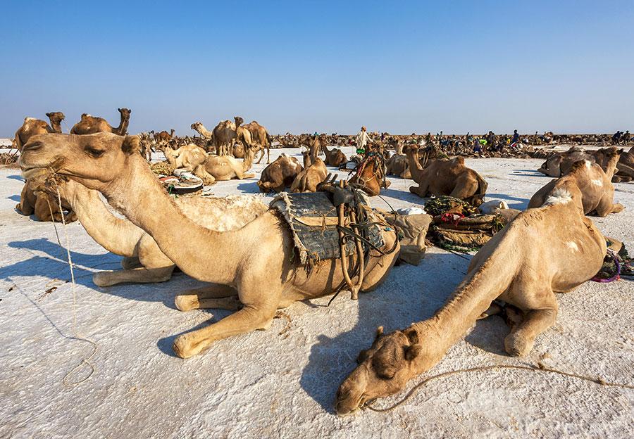 Im kleinen Dorf Abdella Ali verhandelt unser Tour-Leiter mit dem Dorfältesten. Wir brauchen sechs Kamele für den Transport der Ausrüstung auf den Vulkan Erta Ale. Um fünf Uhr morgens starten wir zum zehn Kilometer langen Aufstieg. Nach knapp vier Stunden erreichen wir den Kraterrand, wo einige einfache Steinhütten mit Strohdächern aufgebaut wurden. Zusammen mit einem Reisekollegen miete ich für die nächsten drei Tage eine Hütte als Schutz vor Hitze und Sonne.
