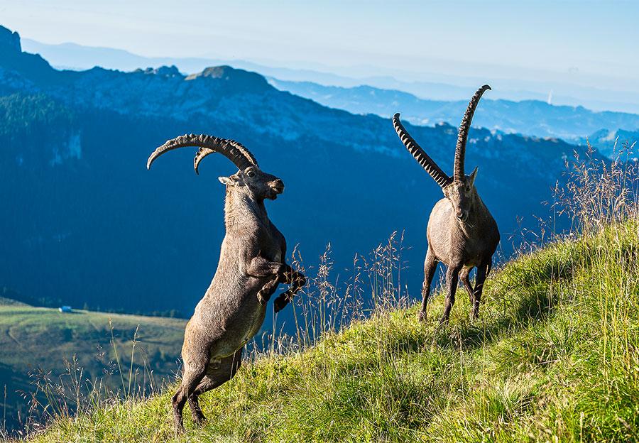 Mit seinen mächtigen bis zu ein Meter langen Hörnern und dem kräftigen Körper ist der Alpensteinbock (Capra ibex) zweifellos eines der imposantesten Tiere unserer Bergwelt. Viele wissen jedoch nicht, dass ausschliesslich die männlichen Tiere den eindrucksvollen Kopfschmuck tragen. Ob ich die Gämsen auch gesehen hätte, so sprachen mich schon mehrmals Wanderer an, wenn ich mit meinem Fotoapparat in den Bergen unterwegs war. Fragte ich dann etwas genauer nach, stellte sich meistens heraus, dass die Leute keine Gämsen, sondern Steingeissen, weibliche Steinböcke, gesehen hatten. Denn im Gegensatz zu den Böcken verfügen diese und auch die jungen Männchen nur über kurze, feine Hörner.