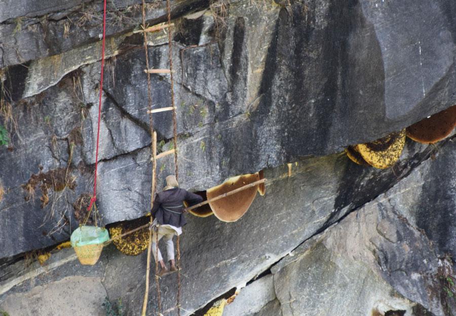 Es ist ein weiter Weg zu den Honigjägern. Erst fliegen wir von Delhi nach Kathmandu, und von Nepals Hauptstadt aus ist es nochmal eine Tagesreise: Mit dem Jeep fahren wir über teils gefährliche Wege. Dann, als das Weiterfahren unmöglich wird, marschieren wir zu Fuss weiter. Der Dorfvorsteher holt uns ab und geht voran. Er ist alt, zierlich und läuft munter barfuss die kleinen Pfade hinauf. Die Luft wird dünner. Unter uns windet sich ein türkisfarbener Fluss durch die malerische Landschaft. Ziegen klettern wenige Meter über uns in den Felsen herum. Wir nähern uns dem Dorf. Ein Mann pflügt mit zwei Ochsen kleine Feldabschnitte. Frauen tragen grosse Holzkörbe, die mit einem Riemen an der Stirn befestigt sind. Ich fühle mich wie in einem alten Film, einer längst vergangenen Zeit. Neugierig empfangen uns die Kinder. Die Erwachsenen reagieren überwiegend freundlich, andere etwas kritisch – wahrscheinlich haben sie noch nie eine Weisse im Dorf gesehen. Ganz oben steht eine Schule. Es gibt keinen Arzt, nur eine Art Priester. Ein Junge schnüffelt an meinem Arm. Es ist sehr ärmlich hier. Nirgends sehe ich eine Dusche oder Toilette. Man wäscht sich mit dem Wasser aus dem Schlauch, der aus einer Quelle alle Häuser versorgt. Unsere Gastgeber sind alt, aber fit. Still, mit interessantem Nasenschmuck und weissem Zopf, sitzt die Grossmutter vor dem Haus. Sie ist etwa 92 Jahre alt, so genau weiss sie es nicht. Eine Unmenge Fliegen setzen sich immer wieder auf ihre Füsse und in ihr Gesicht.