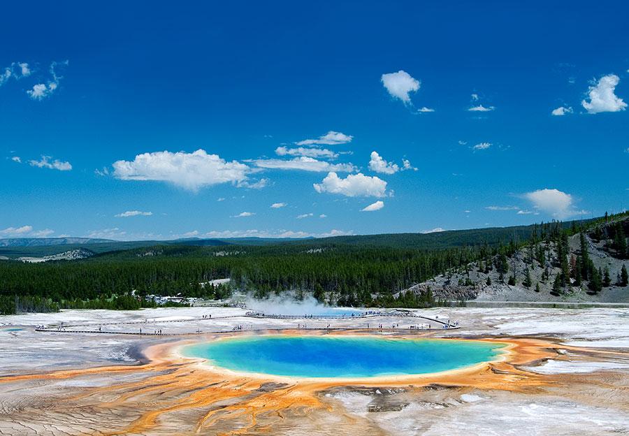 Im Jahr 1872 gründete US-Präsident Ulysses S. Grant das erste Naturschutzgebiet der Welt, eigentlich nicht in erster Linie, um die Natur zu schützen, sondern als öffentlichen Park für die Menschen. Der Hauptgrund für die Schaffung des Parks waren sicher die zahlreichen vulkanischen Aktivitäten in der Region. Bereits 1946 stieg die Besucherzahl erstmals über eine Million, letztes Jahr gar über vier Millionen. Mit einer Fläche von 8987 km² – das entspricht jener von Korsika – zählt er zu den grössten Nationalparks der USA. Mehrheitlich liegt er im Bundesstaat Wyoming, nur ein kleiner Teil befindet sich in Montana sowie in Idaho und gehört zu den Rocky Mountains. Zusammen mit dem Grand-Teton- Nationalpark und weiteren Schutzgebieten bildet der Park das so genannte Yellowstone Greater Ecosystem – das letzte grosse, beinahe intakte Ökosystem in der nördlichen gemässigten Zone der Erde.