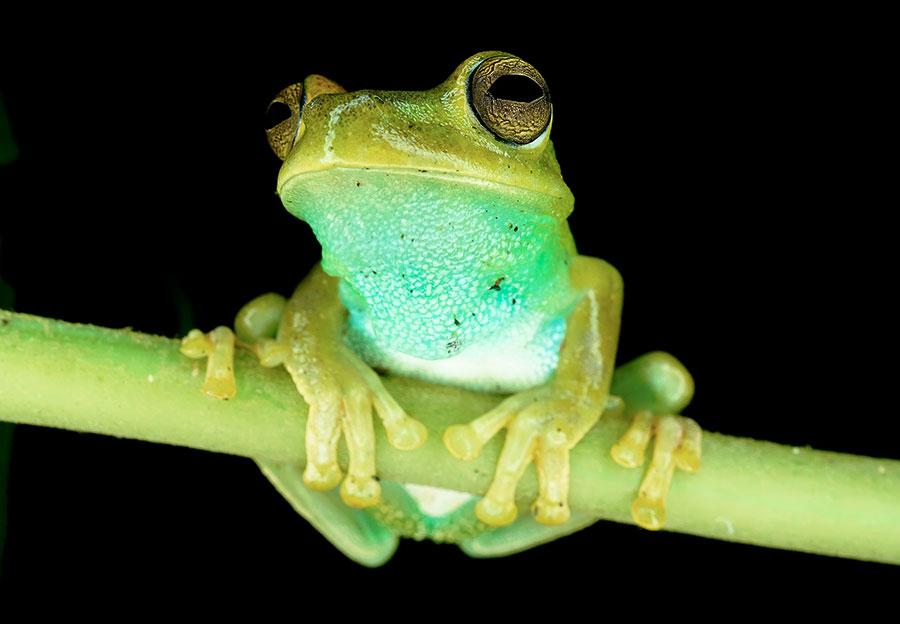 Der südamerikanische Baumfrosch, Hypsiboas punctatus. Noch nicht lange haben Forscher der Universität Buenos Aires herausgefunden, dass der Frosch eine fluoreszierende Haut besitzt. Unter ultraviolettem Licht strahlt das Tier blaugrün. Auf diese Weise leuchtet es im Dunkeln, als sei es in einen Farbtopf gefallen. Verschiedene Stoffe in der Lymphflüssigkeit und den Hautdrüsen der Tiere sind für den Effekt verantwortlich. Die Wissenschaftler untersuchten männliche als auch weibliche Frösche: Beide Geschlechter strahlen giftgrün. Der Effekt scheint daher für die Paarung nicht wichtig zu sein. Die Forscher vermuten, dass die Frösche neben akustischen und chemischen Signalen auch mit Hilfe der Fluoreszenz kommunizieren. Ob die Tiere die Leuchtfarbe überhaupt sehen können, ist bislang aber nicht bewiesen. Es ist die erste bisher bekannte Amphibie mit dieser Eigenschaft.