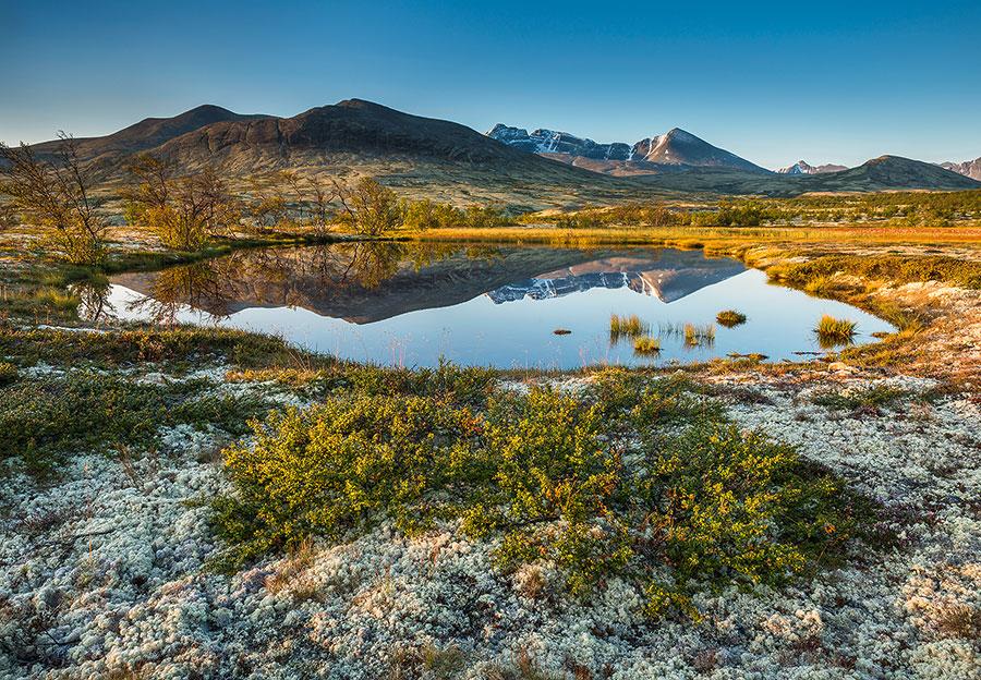 Rondane ist eine typische Hochgebirgslandschaft mit neun Gipfeln über 2000 m. Selbst der niedrigste Punkt liegt eher hoch und befindet sich nur knapp unter der Waldgrenze, d. h. etwas weniger als 1000 m. Die wilde und archaische Landschaft erscheint auf den ersten Blick lebensfeindlich. Wenn man aber genauer hinblickt, entdeckt man überall Leben und manch verborgene Schönheiten. Vielleicht hat dieses Gebiet genau deshalb so viele Künstler und Dichter inspiriert und womöglich ist dies auch der Grund, weshalb die Menschen seit Generationen immer wieder nach Rondane zurückkehren. Auch mir geht es so. Die Weite der Landschaft und besonders die herbstlichen Farben dort haben es mir angetan. Auch wenn diesbezüglich das Timing bei meinem letzten und bisher einzigen Besuch leider nicht ganz gepasst hat, fanden wir im Norden doch ein wahres Wunderland vor.