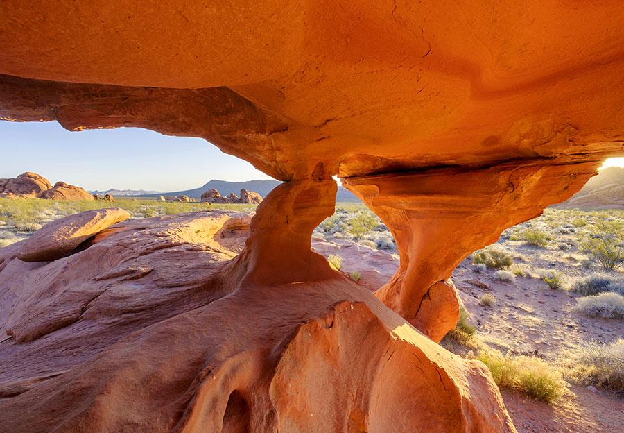 Weiter südlich befindet sich der Joshua-Tree-Nationalpark. Er bekam seinen Namen von den Joshua-Bäumen, einem bis zu zehn Meter hohen Agavengewächs. Im Park gefallen mir aber auch die abgerundeten und übereinandergeschichteten Granitblöcke. Sie bilden verstreute Inselberge, die sich aus den Ebenen aus trockenem Gras erheben. Im Licht der aufgehenden Sonne beginnen sie orangerot zu leuchten.